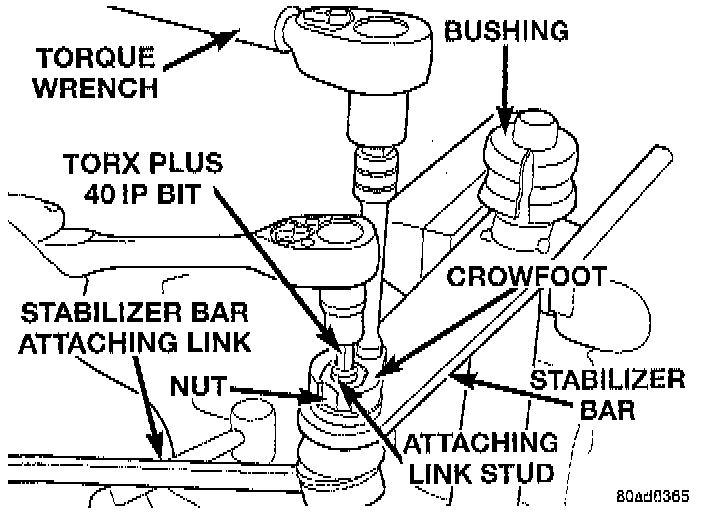 4. Hold the attaching link stud from rotating using a Torx Plus 40 IP Bit placed in the end of the stud. Using a crowfoot as shown tighten the stabilizer bar attaching link nut to a torque of 122 Nm (90 ft. lbs.).
