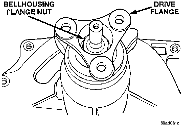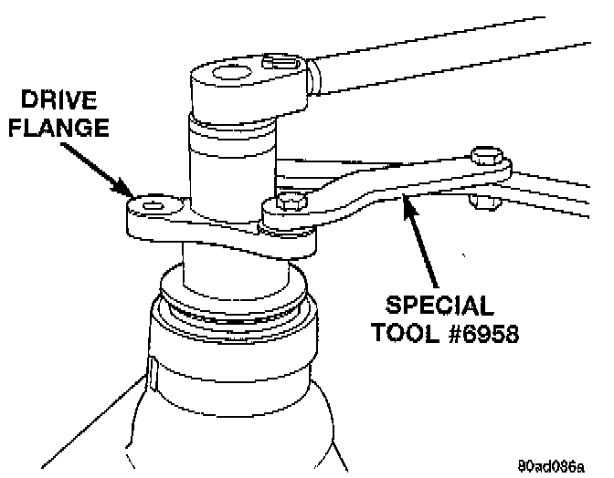 12. Install flange, install the washer and a new nut on the shaft. Tighten flange nut using Special Tool # 6958, or equivalent holder. Use a deep 1 1/4 inch socket.