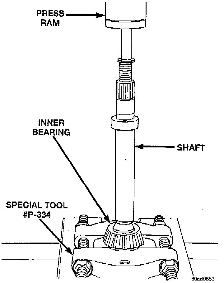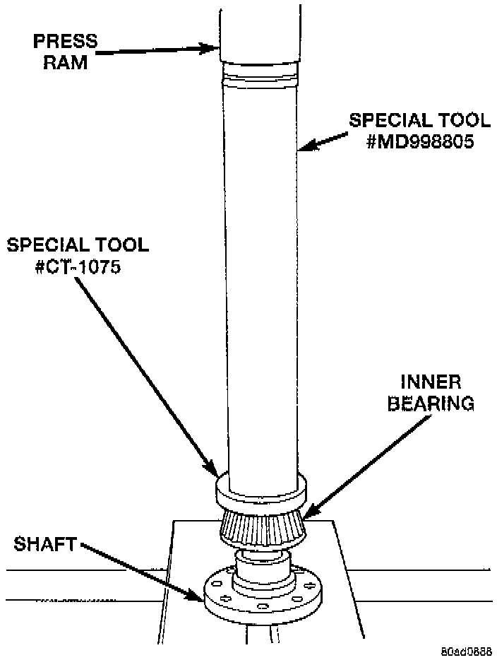 3. Install new inner bearing to shaft using Special Tool # CT-1075 adapter, and MD998805 driver, or equivalents. Press on new bearing in shop press.