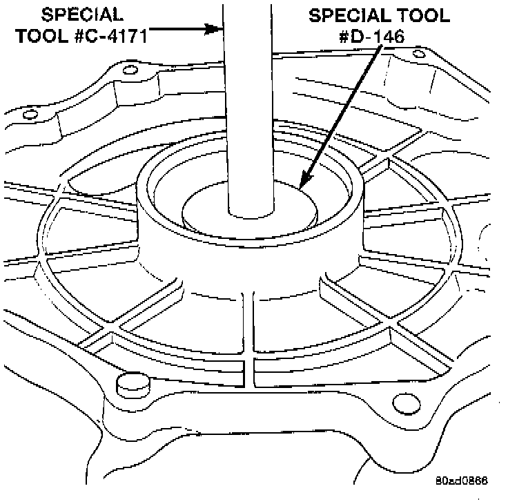 1. Install inner bearing cup to housing using Special Tool # D-146 installer, and C-4171 driver, or equivalents.