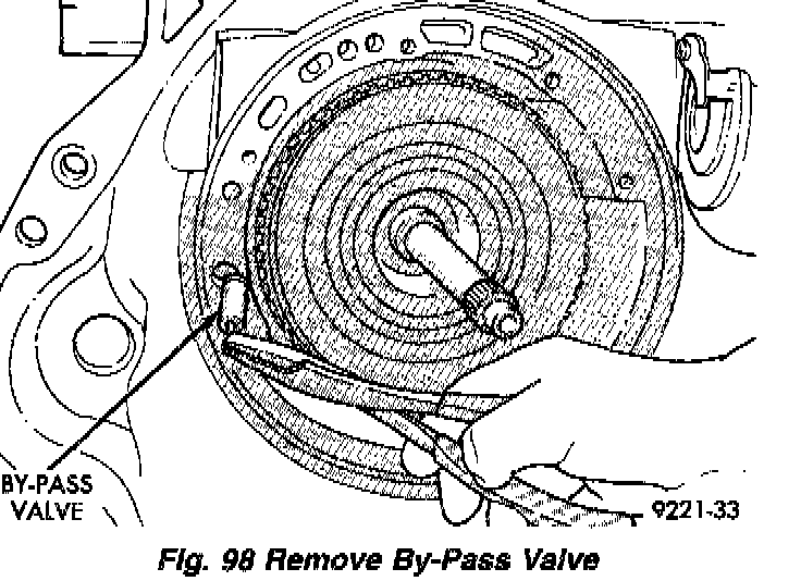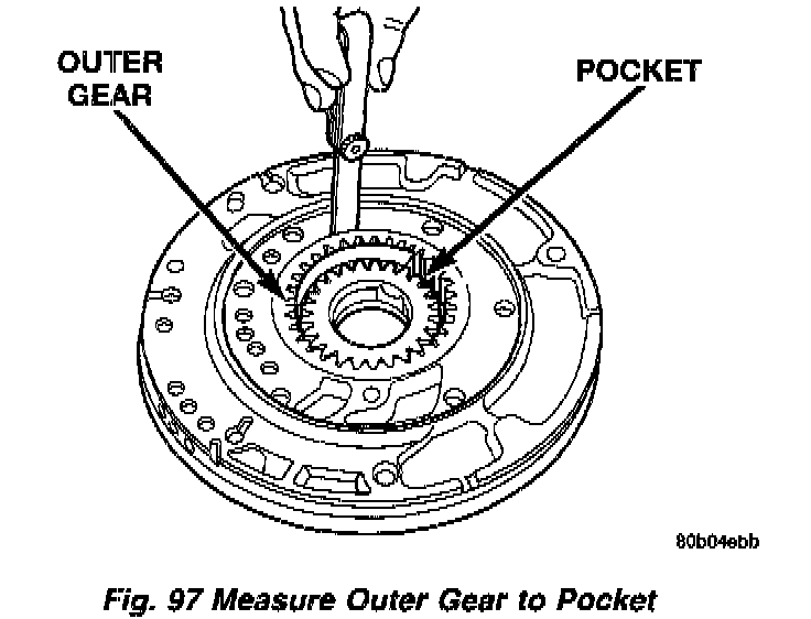 5. Measure the clearance between the outer gear and the pump pocket (Fig. 97). Clearance should be 0.045 - 0.141mm (0.0018 - 0.0056 inch).