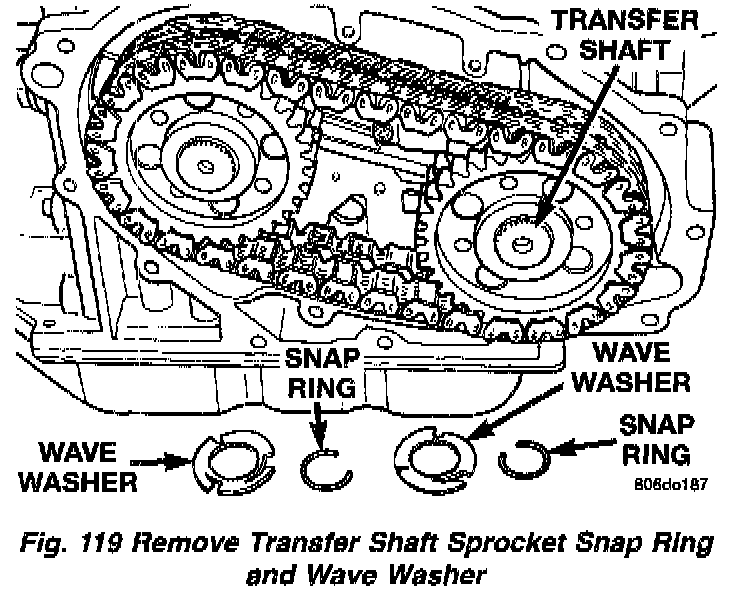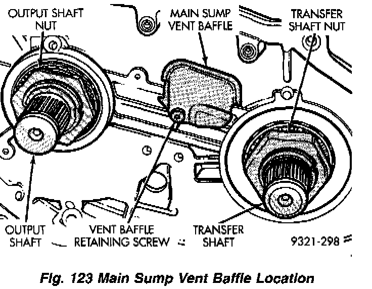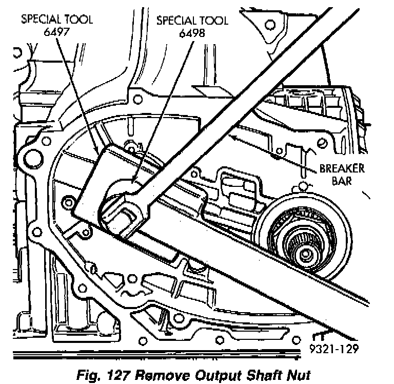 Use special tool 6497 and 6498 to remove the transfer shaft nut or the output shaft nut (Fig. 127). Note that your breaker bar will turn clockwise to remove the nut and counter clockwise to install the nut.