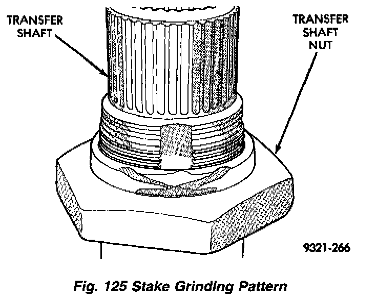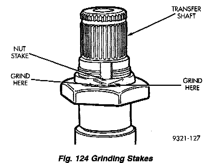 Using a die grinder or equivalent, grind the stakes in the shoulder of the shaft nuts as shown in (Fig. 124) and (Fig. 125). Do not grind all the way through the nut and into the shaft. There are two stakes on each nut.