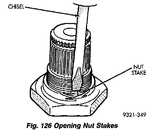 Using a small chisel, carefully open stakes on nut (Fig. 126).