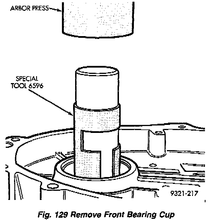 Use special tool 6596 to remove front output shaft bearing cup (Fig. 129).