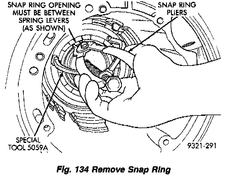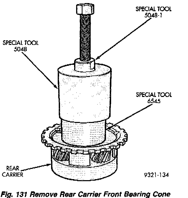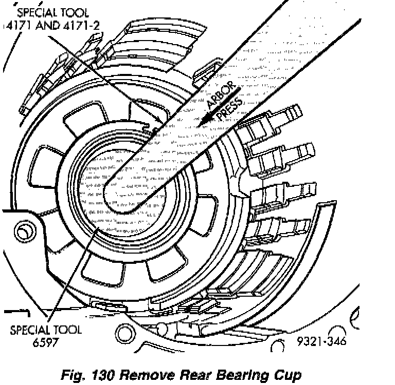 Use special tool 6597 and handle C-4171 and C-4171-2 to press rear output shaft bearing cup rearward (Fig. 130).