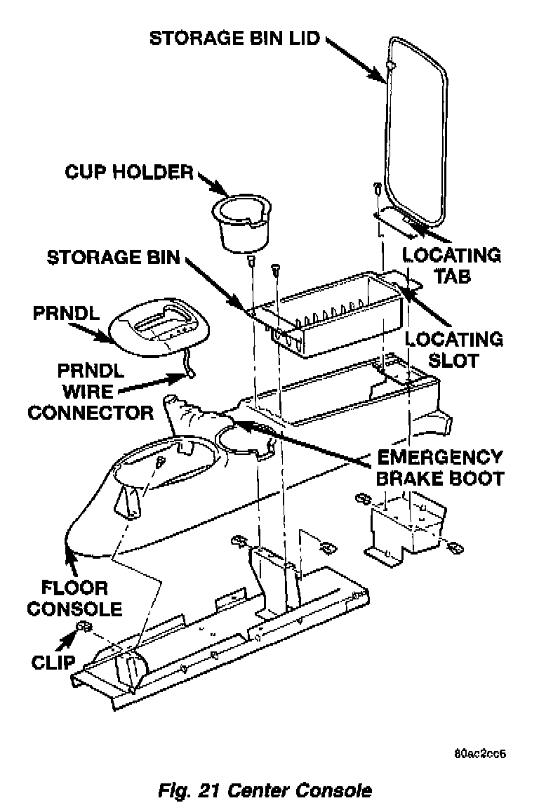 10. Open console bin cover and remove console retaining screws (Fig. 21).