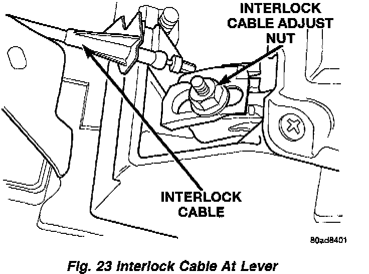 15. Remove the interlock cable from the shifter housing (Fig. 22). Slide the cable out of the groove in the interlock lever (Fig. 23).