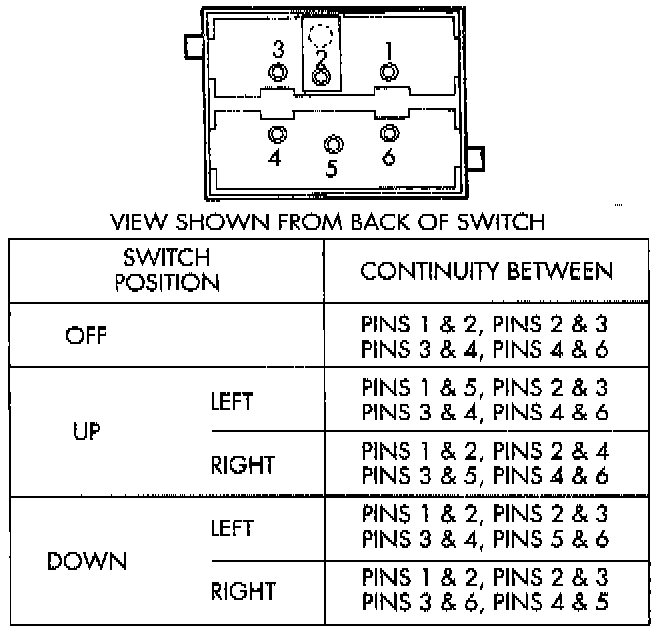 4. Connect the positive lead to Pin 1 of the harness connector and check for battery voltage. If OK, go to Window Switch Test below. If not OK, check circuit breaker in the Micro Relay Bank. If the circuit breaker is OK, repair wire as necessary.
