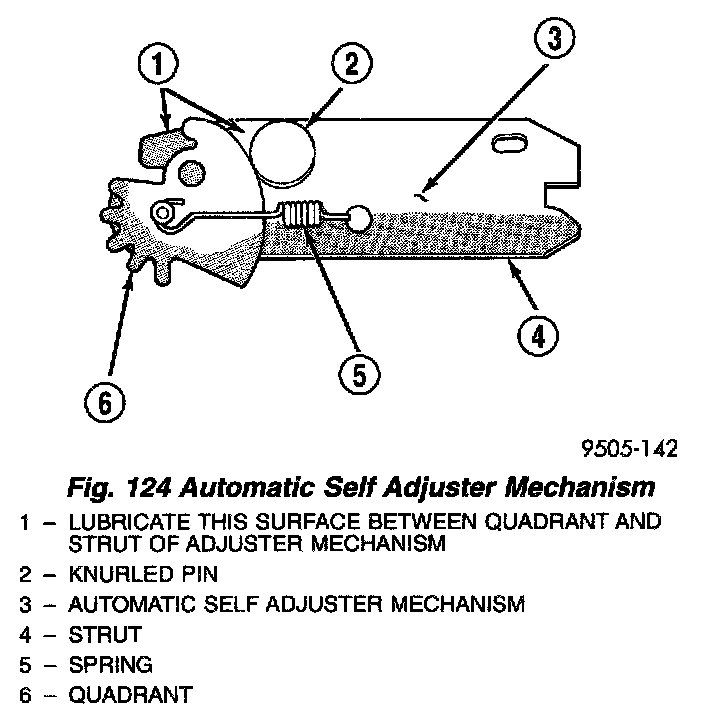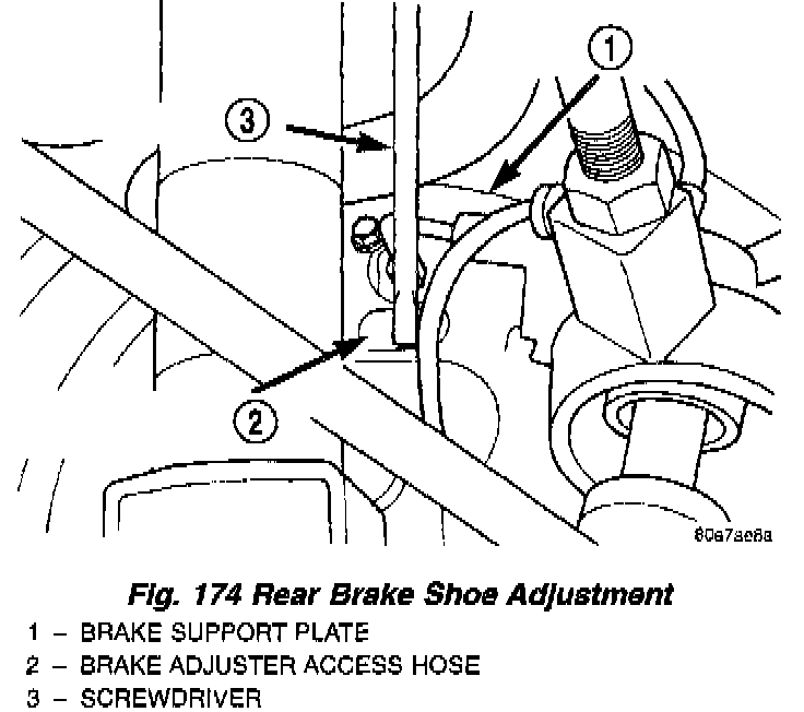 NOTE: Unique to this vehicle is a new fully automatic adjusting mechanism for the rear drum brakes. The rear drum brakes used on this vehicle have no provisions to be manually adjusted and should not require manual brake shoe adjustment for the life of the linings. Although in the event of a brake reline, it will require the automatic adjuster to be reset. After resetting the automatic adjuster the initial adjustment procedure must be done prior to driving the vehicle.
