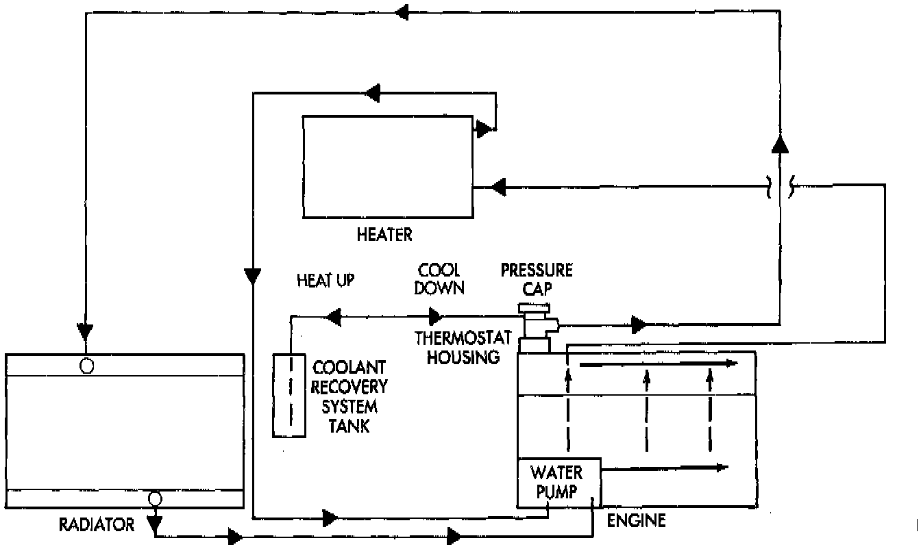 The cooling system consists of an engine cooling module, thermostat, coolant, a water pump to circulate the coolant. The engine cooling module may consist of a radiator, electric fan motor, shroud, radiator pressure cap, coolant reserve system, transmission oil cooler and lines, hoses, clamps, and air conditioning condenser.- When Engine is cold: Thermostat is closed, cooling system has no flow through the radiator. The coolant bypass flows through the engine and heater core.