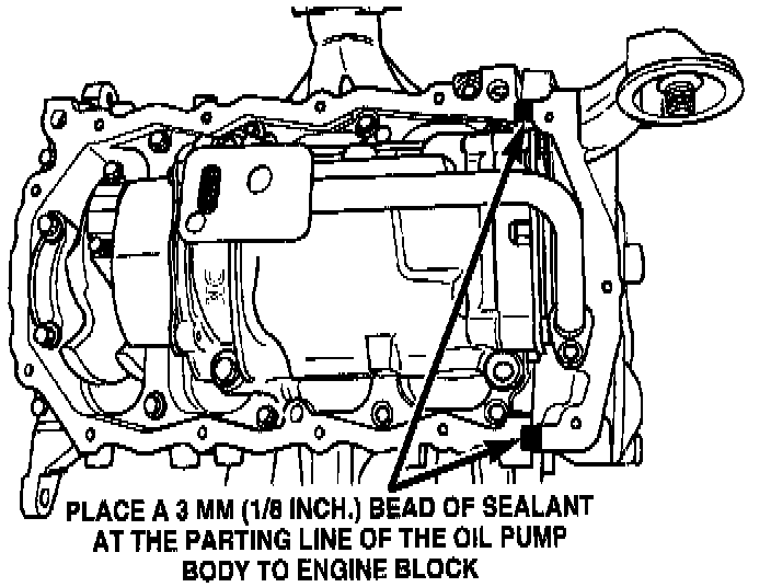 1. Apply Mopar Silicone Rubber Adhesive Sealant or equivalent at the oil pump to engine block parting line.