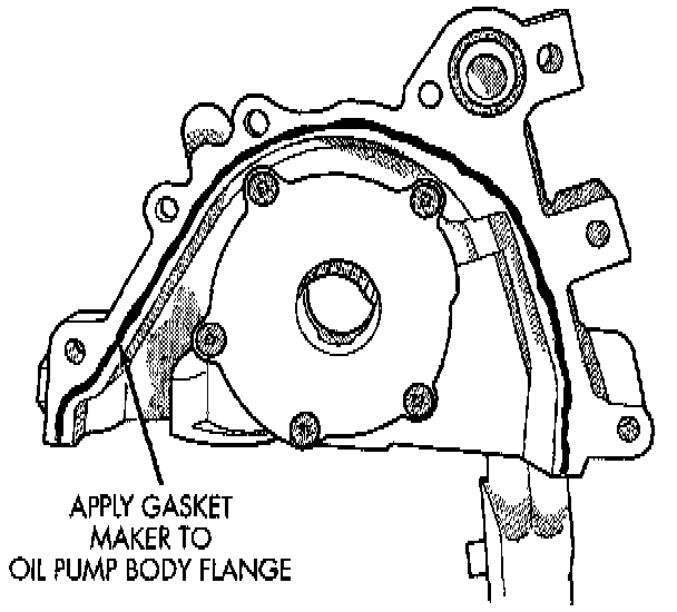 2. Apply Mopar Gasket Maker to oil pump. Install oil ring into oil pump body discharge passage.