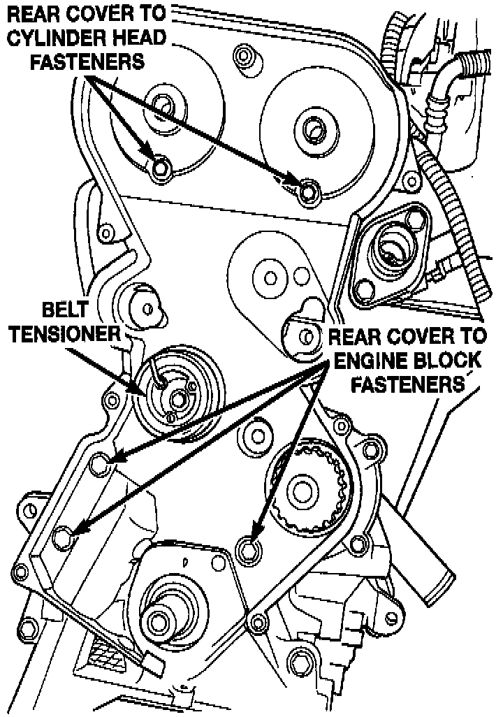 4. Remove rear timing belt cover fasteners and remove cover from engine.