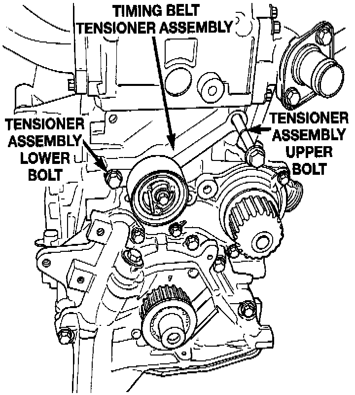 1. Align timing belt tensioner assembly to engine and install lower mounting bolt but do not tighten. To properly align tensioner assembly-install one of the engine bracket mounting bolts (M10) 5 to 7 turns into the tensioner's upper mounting location.