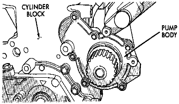 2. Assemble pump body to block and tighten screws to 12 Nm (105 inch lbs.). Pressurize cooling system to 15 psi with pressure tester and check water pump shaft seal and O-ring for leaks.