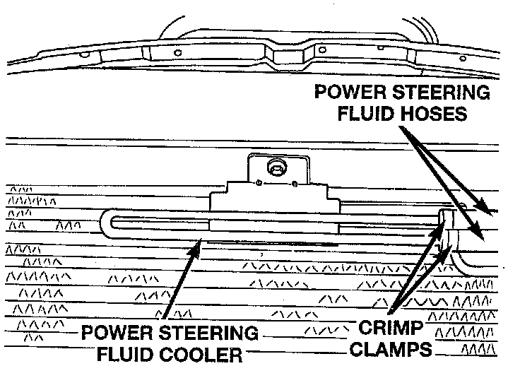 9. Install power steering fluid hoses on the power steering fluid cooler. Install the hose clamps on the power steering fluid hoses. Be sure hose clamps are installed on hose past the upset bead on the power steering oil cooler.