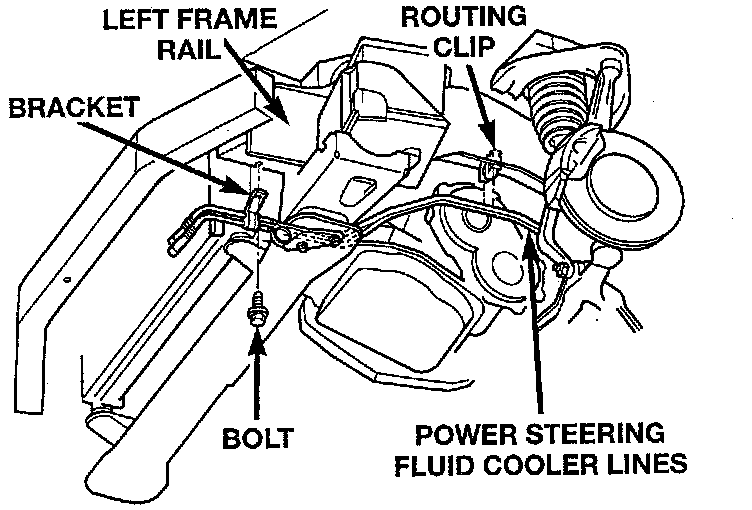 8. Install the bracket attaching the power steering cooler lines to the left frame rail. Install bracket attaching bolt and tighten to a torque of 7 Nm (60 inch lbs.).