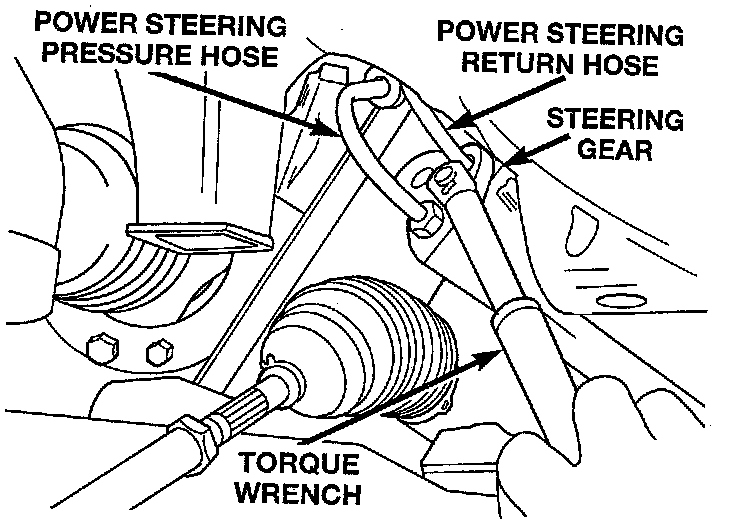 4. Install the power steering fluid return hose on the steering gear. Then using a crow foot and torque wrench tighten the tube nut to a torque of 31 Nm (275 inch lbs.).