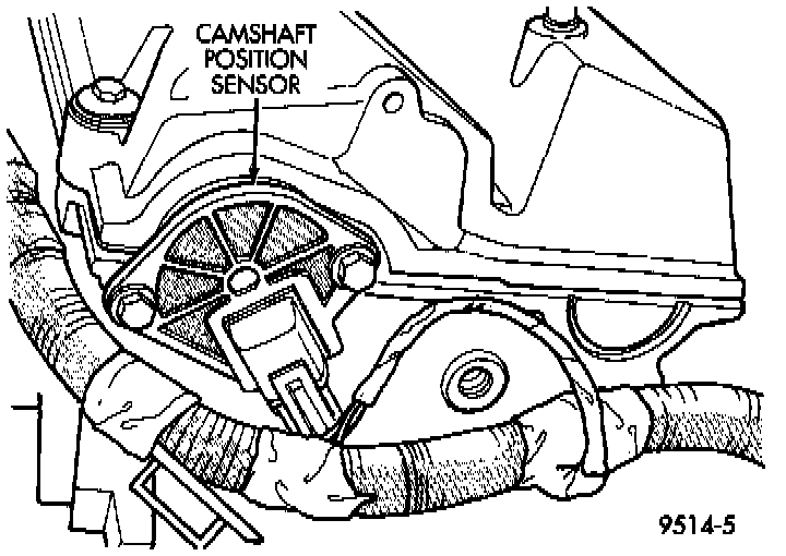 The camshaft position sensor attaches to the rear of the cylinder head Fig. 7. The sensor also acts as a thrust plate to control camshaft end-play.