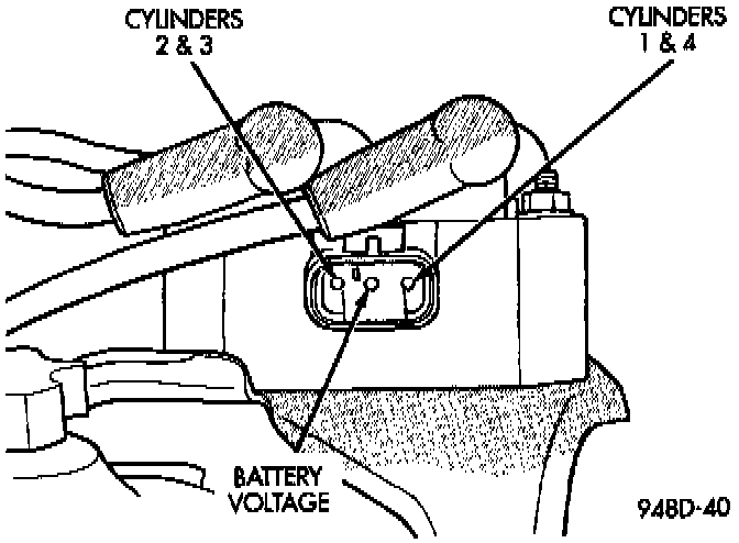 3. Measure the primary resistance of each coil. At the coil, connect an ohmmeter between the B+ pin and the pin corresponding to the cylinders in question Fig. 2. Resistance on the primary side of each coil should be 0.45 - 0.65 ohm @ 70° - 80° F. Replace the coil if resistance is not within tolerance.