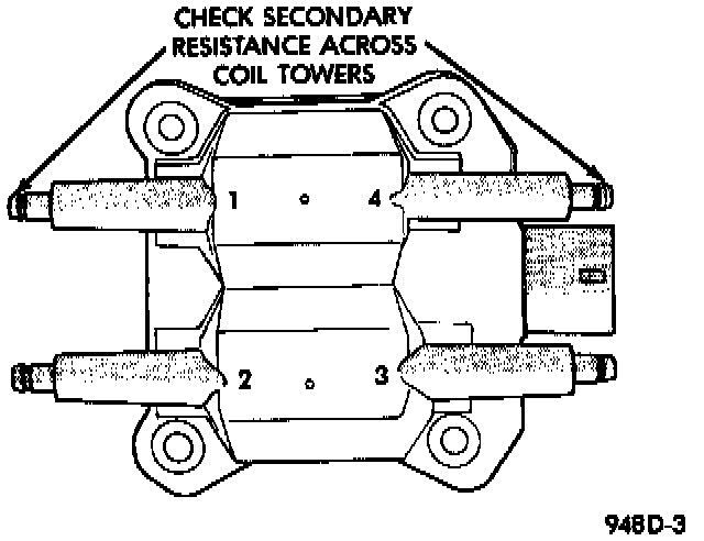 4. Remove ignition cables from the secondary towers of the coil. Measure the secondary resistance of the coil between the towers of each individual coil Fig. 3. Secondary resistance should be 7,000 to 15,800 ohms. Replace the coil if resistance is not within tolerance.
