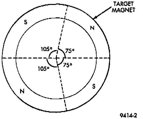 The camshaft position sensor attaches to the rear of the cylinder head Fig. 4. A target magnet attaches to the rear of the camshaft and indexes to the correct position. The target magnet has four different poles arranged in an asymmetrical pattern. As the target magnet rotates, the camshaft position sensor senses the change in polarity Fig. 5. The sensor input switches from high (5 volts) to low (0.30 volts) as the target magnet rotates. When the north pole of the target magnet passes under the sensor, the output switches high. The sensor output switches low when the south pole of the target magnet passes underneath.