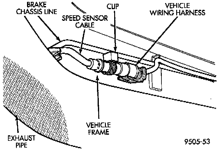 3. Unplug speed sensor cable connector from vehicle wiring harness. Remove clip attaching speed sensor cable connector to vehicle body.
