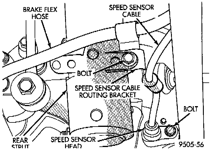 5. Remove bolt attaching the rear wheel speed sensor to the disc brake adapter. Then remove bolt attaching speed sensor cable routing bracket to rear strut assembly.