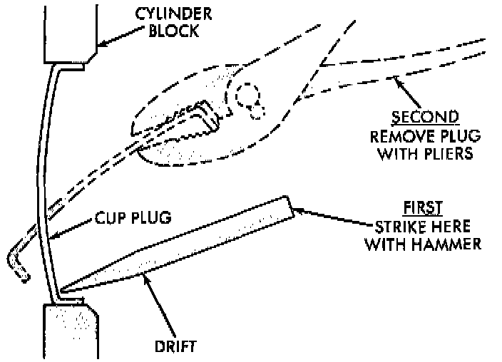 Using a blunt tool such as a drift or a screwdriver and a hammer, strike the bottom edge of the cup plug. With the cup plug rotated, grasp firmly with pliers or other suitable tool and remove plug.