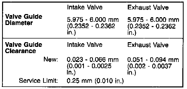 Valve Guide Specification Chart: