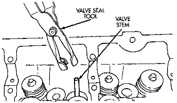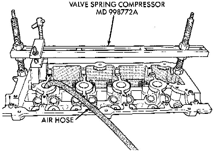 2. Install valve spring and retainer. Using Special Tool MD998772A compress valve springs only enough to install locks. Correct alignment of tool is necessary to avoid nicking valve stems (air pressure required), piston at TDC.