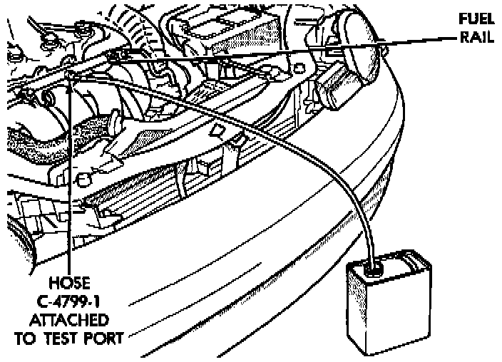 5. Place the open end of fuel pressure release hose, Special Tool C-4799-1, into an approved gasoline container. Connect the other end of hose to the fuel pressure test port. Fuel pressure will bleed off through the hose into the gasoline container. Fuel gauge C-4799-A contains hose C-4799-1.