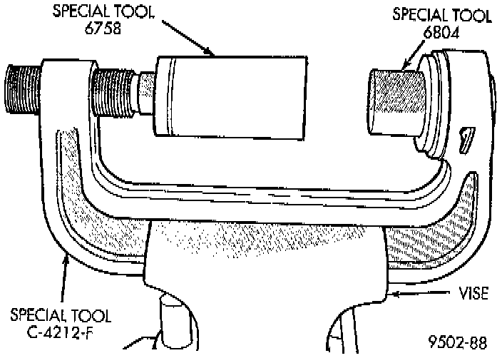 2. Mount Remover/Installer, Special Tool C-4212-F, or equivalent in a vise. Install Bushing Remover, Special Tool 6804 and Bushing Receiver, Special Tool 6758 on Special Tool C-4212-F, or equivalents.