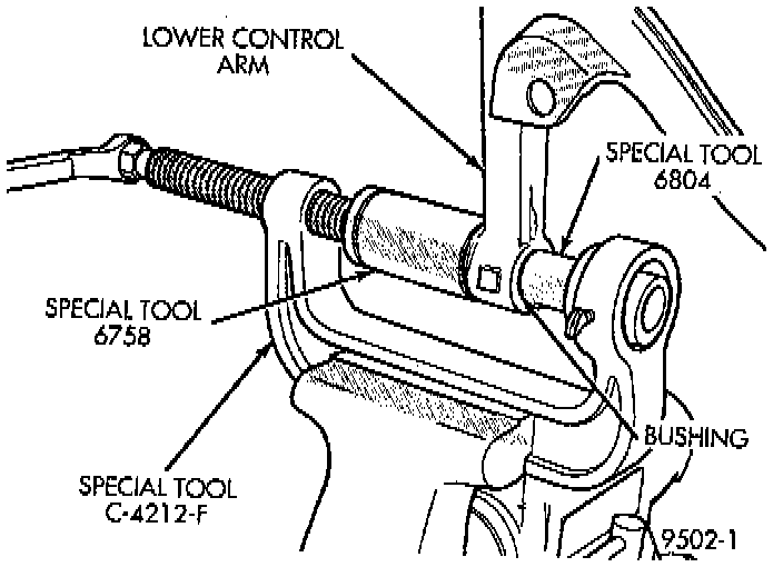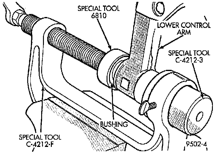 4. Tighten screw on Remover/Installer Special Tool C-4212-F, or equivalent to press front bushing out of lower control arm.