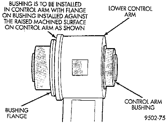 2. Start front bushing into lower control arm by hand, making sure it is square with its mounting hole in the lower control arm. Bushing is to he installed in lower control arm from the machined surface side of lower control arm bushing hole.