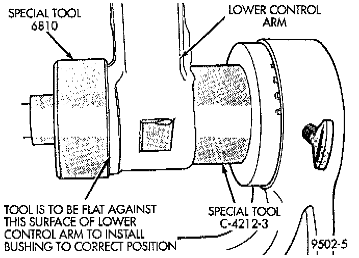 4. Tighten screw on Remover/Installer Special Tool C-4212-F, or equivalent pressing front bushing into lower control arm. Continue pressing front hushing into lower control arm until special tool 6810 is sitting flush on the machined surface of the lower control arm. This will correctly position front hushing in lower control arm.