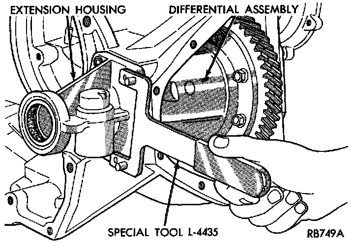 To remove the differential bearing cup from the extension housing/adapter side, use Special Tool 6062A, Remover. To install the differential bearing cup on the extension housing adapter side, use Special Tool 6536, Driver and Special Tool C-4171, Handle.