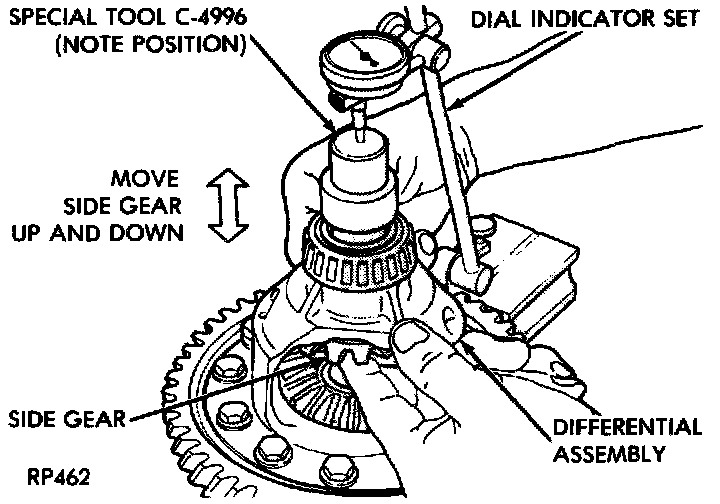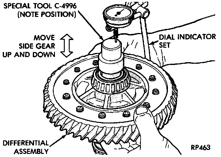 CAUTION: Side gear end play must be BETWEEN 0.001 to 0.013 inch.