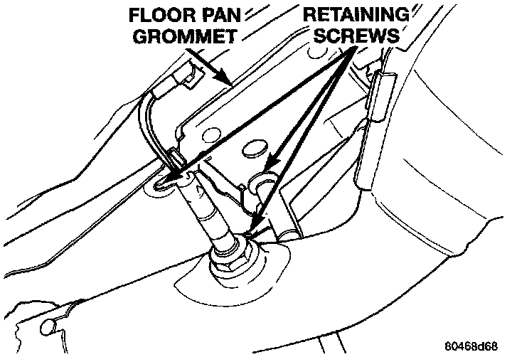 11. Lift vehicle on hoist. Remove self-tapping screw securing grommet plate to underbody heat shield and floor pan.