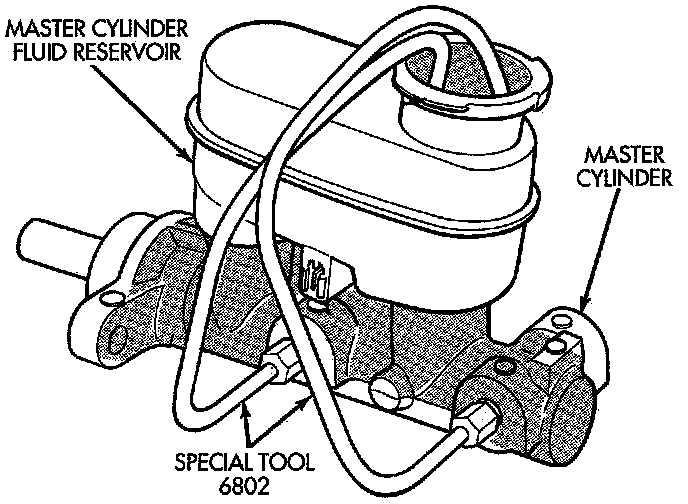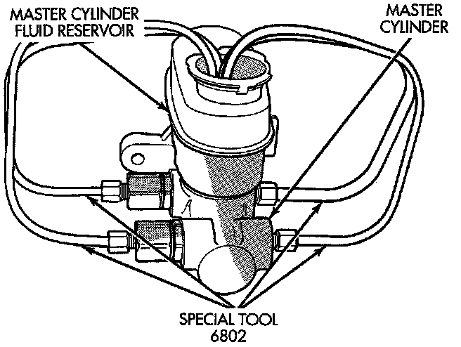 1. Clamp the master cylinder in a vise. Attach Bleeding Tubes, Special Tool 6802 or equivalent to the master cylinder. Position so outlets of Bleeding Tubes will be below surface of brake fluid when reservoir is filled to its proper level.