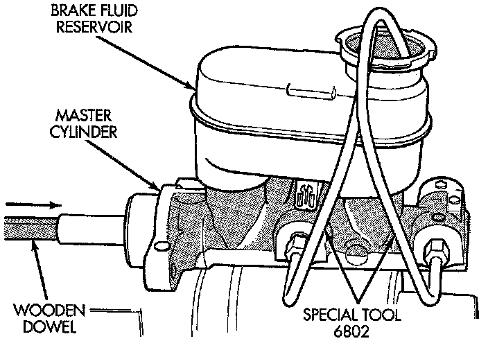 3. Using a wooden dowel. Depress push rod slowly, and then allow pistons to return to released position. Repeat several times until all air bubbles are expelled.