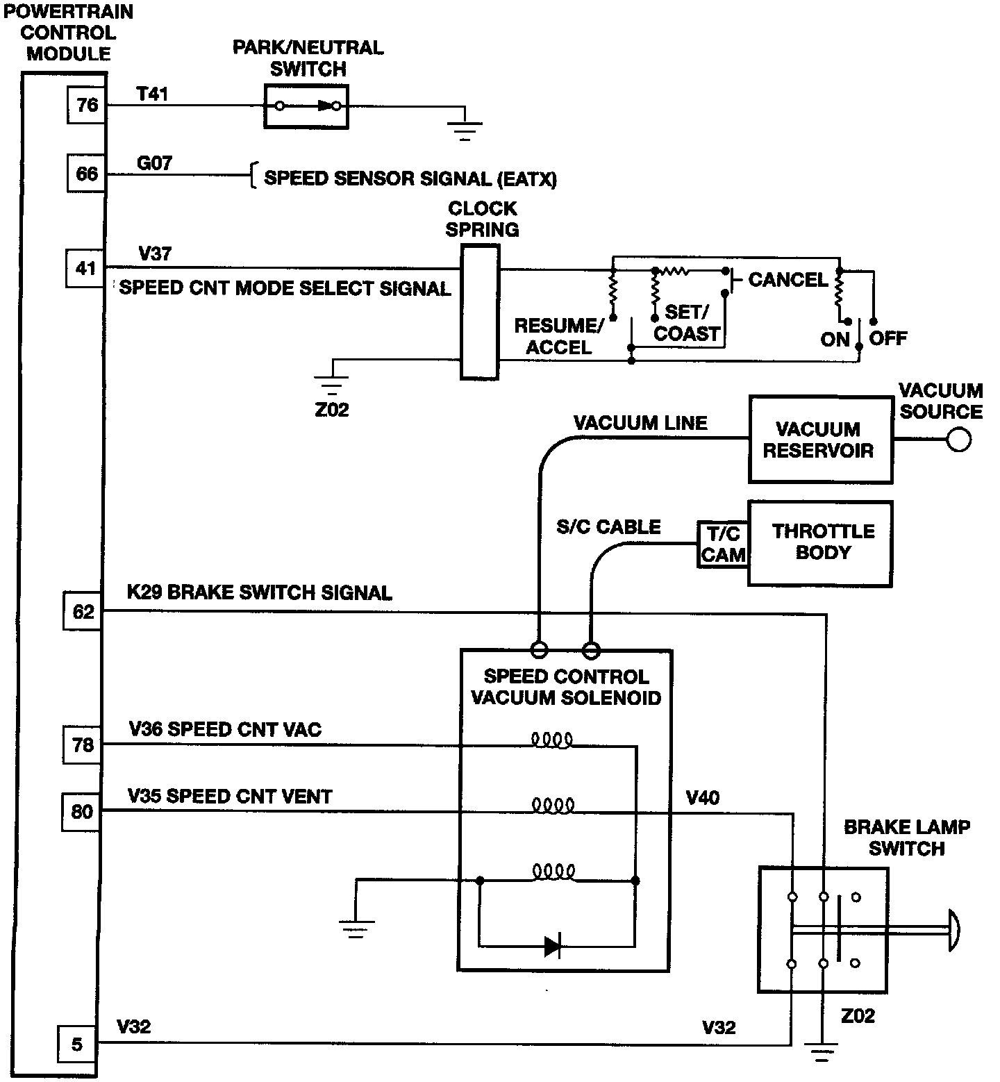 Electronic speed control systems may be tested using two different methods. One involves use of a DRB. If this test method is desired, refer to the Powertrain Diagnostic Test Procedures for charging and speed control system.The other test method uses a volt/ohm meter. The volt/ohm meter method is described in the following tests.