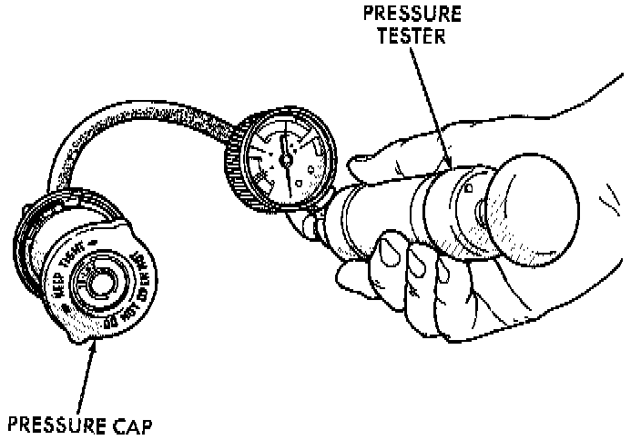 Dip the pressure cap in water; clean off any deposits on the vent valve or its seat, and apply the cap to end of radiator pressure tester. Working the plunger, increase the pressure to 104 kPa (15 psi) on the gauge. If the pressure cap fails to hold pressure of at least 97 kPa (14 psi), replace the cap.