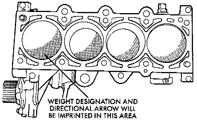 3. Pistons will have a stamping in the approximate location shown. These stamps will be either a directional arrow or a weight identification for the assembly. L is for light and H is for heavy. These assemblies should all be the same weight class. Service piston assemblies are marked with a S and can be used with either L or H production assemblies. The weight designation stamps should face toward the timing belt side of the engine.