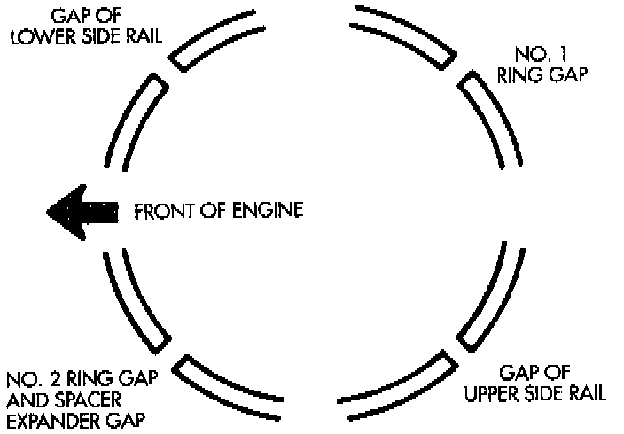 1. Before installing pistons and connecting rod assemblies into the bore, be sure that compression ring gaps are staggered so that neither is in line with oil ring rail gap.