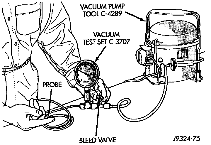 Use an adjustable vacuum test set (Special Tool C-3707) and a suitable vacuum pump to test the heater-A/C vacuum control system. With a finger placed over the end of the vacuum test hose probe, adjust the bleed valve on the test set gauge to obtain a vacuum of exactly 27 kPa (8 in. Hg.). Release and block the end of the probe several times to verify that the vacuum reading returns to the exact 27 kPa (8 in. Hg.) setting. Otherwise, a false reading will be obtained during testing.
