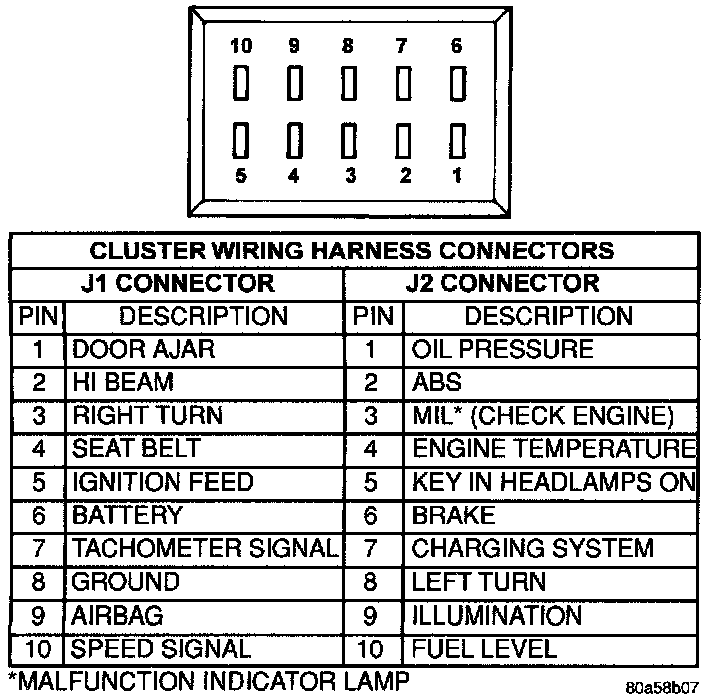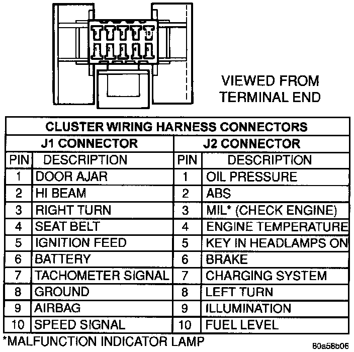 2. Check for ignition voltage at Pin J1-5 of the cluster wire harness connector. Check for battery voltage at Pin J1-6 of the connector. If no voltage, repair as necessary.