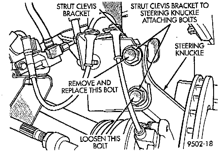 3. Remove original upper bolt attaching the front or rear strut clevis bracket to the steering knuckle or rear knuckle.