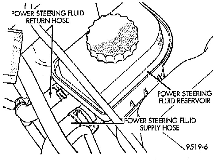 6. Remove hose clamp, attaching power steering return hose to power steering fluid reservoir. Then remove power steering return hose from power steering fluid reservoir